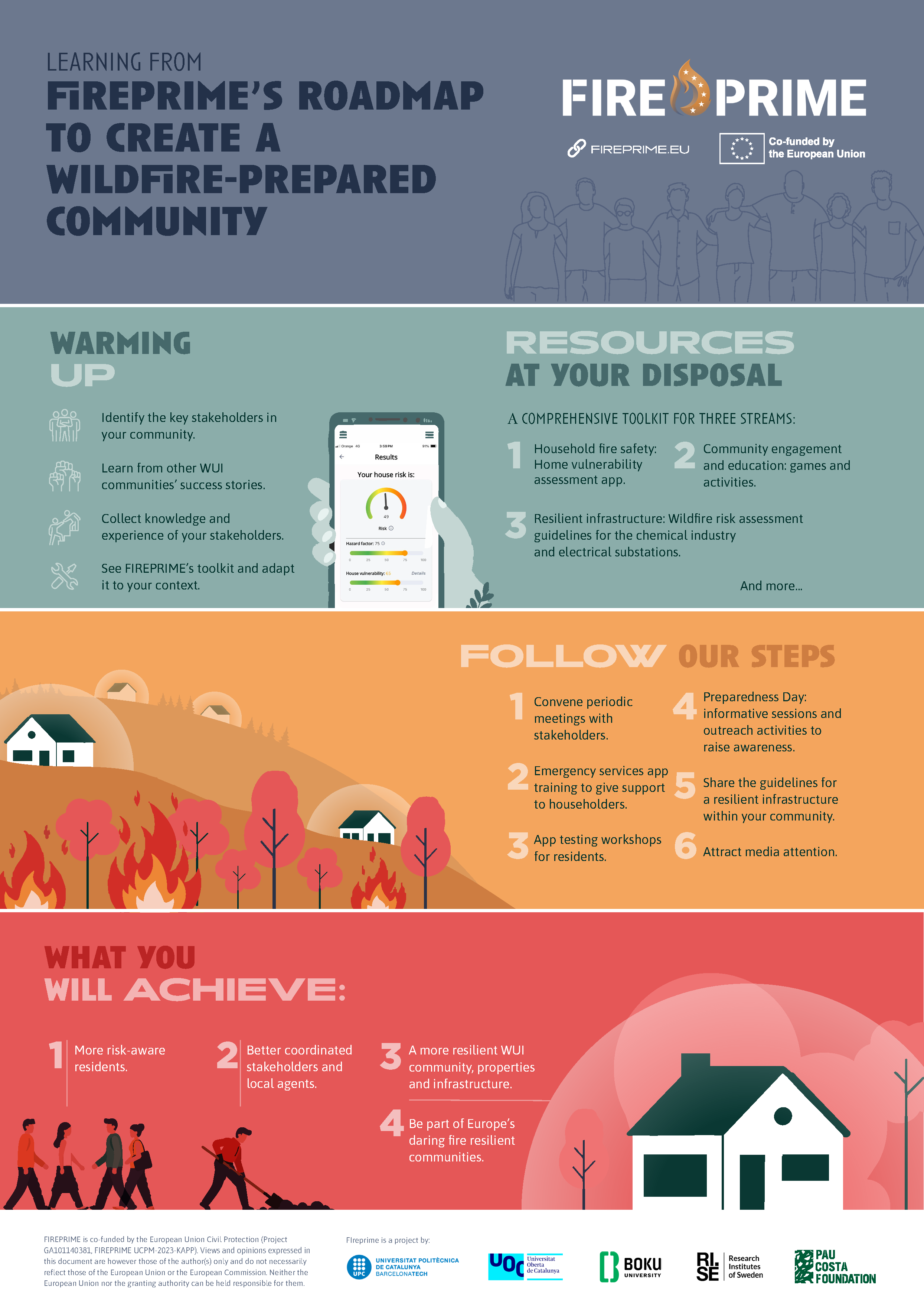 Wildfires are increasingly problematic in Europe, with recent unprecedented events causing extensive damage near Wildland-Urban Interface settlements. These fires pose complex civil protection challenges, highlighting a lack of awareness and preparedness among affected communities. Inspired by successful international frameworks like Firewise and FireSmart, FIREPRIME aims to establish an EU-wide program promoting fire resilience in WUI communities. It will develop a toolkit including a smartphone app, guidelines, and educational materials, aimed at enhancing wildfire resilience in three critical targets: households, communities, and infrastructure. It will be tested in three European regions: Barcelona (Spain), Tyrol (Austria), and Gothenburg (Sweden). The project prioritizes inclusivity and collaboration with local stakeholders to ensure responsiveness to diverse needs. Lessons learned will inform a strategic plan for sustainable project handover and exploitation in other fire-prone European regions.